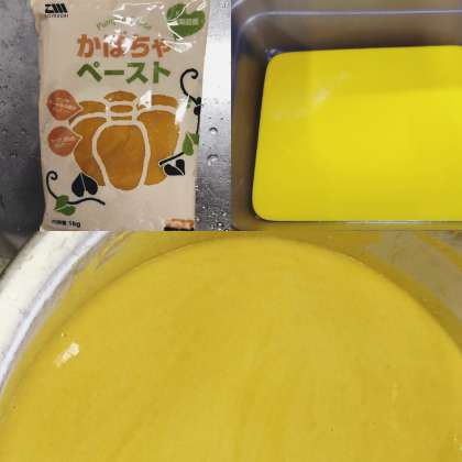 かぼちゃういろうは、かぼちゃ(ペースト)上新粉・砂糖・水を合わせ、焼き物機で蒸して作る和風のデザートです。
