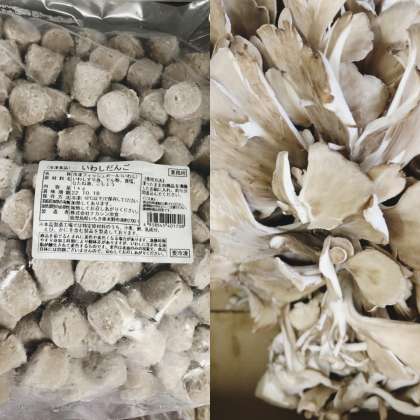 ごはん・豚肉とまいたけの炒め物・いわしのつみれ汁・かぼちゃういろう