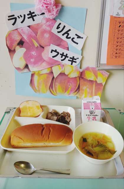 牛肉のオイスターソース焼き・中華スープ・りんご