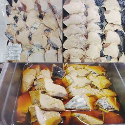 なまりぶしのしょうが煮は、ミニバットになまりぶしを入れ、せん切りのしょうがを加えた調味液を加えて、焼き物機で煮ています。