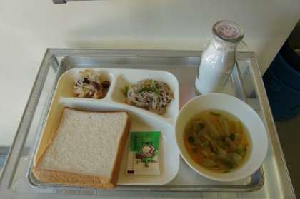 豚肉と野菜のいためもの・すまし汁・金時豆のおこわ・食パン・牛乳