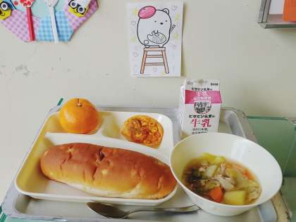 パン・豚肉と野菜のスープ煮・変わりピザ・みかん