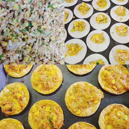 変わりピザは、ツナ・コーン・ピーマン・ピザソース・チーズを混ぜ合わせて、ぎょうざの皮にのせ、焼き物機で焼いています。児童に好評な献立です。