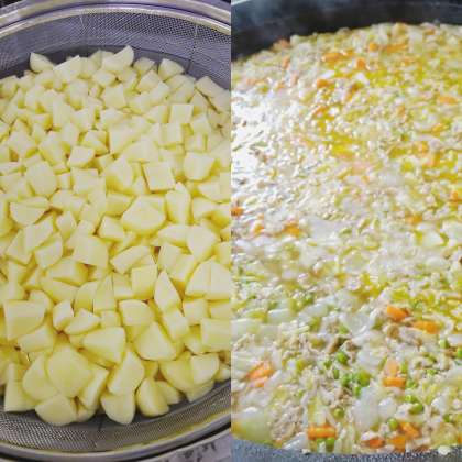 豚肉と野菜のスープ煮は、豚肉を主材に、じゃがいも・たまねぎ・キャベツ・にんじん・マッシュルーム・青みにグリンピースを使用した洋風の煮ものです。