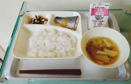 ごはん・さごしのおろしじょうゆかけ・さといものすまし汁・大豆の煮物