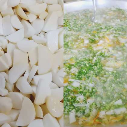さといものすまし汁は、さといも・はくさい・玉ねぎ・にんじん・青みに青ネギの入ったすまし汁です。