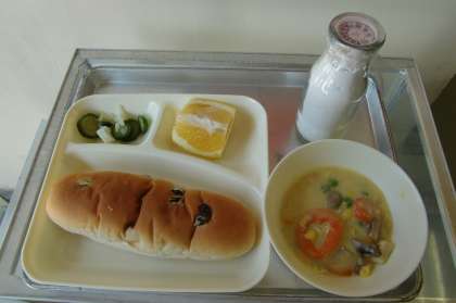 コーンクリームシチュー・グリーンサラダ・河内ばんかん・レーズンパン・牛乳です。