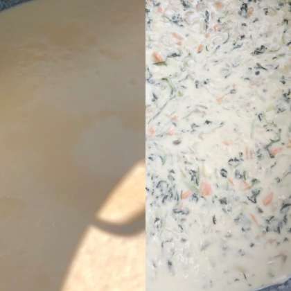 バターに使用制限があるため、ホワイトルウは小麦粉と綿実油で作り、コクを出すためにクリームを加えています。