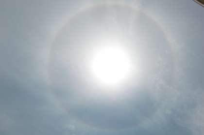 気象庁に聞いてみたところ「日の傘と呼ばれるものがあって、光が屈折して虹のように見えたのでしょう」ということでした。