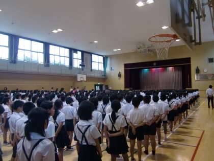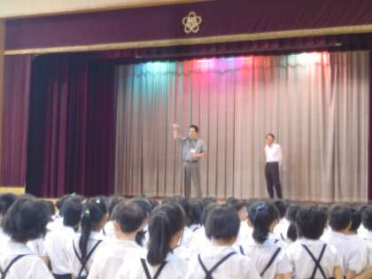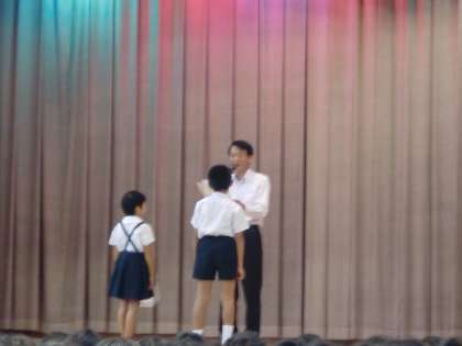 始業式では校長先生のごあいさつの後、2学期より来られた外国語授業(5・6年生)の先生の紹介がありました。