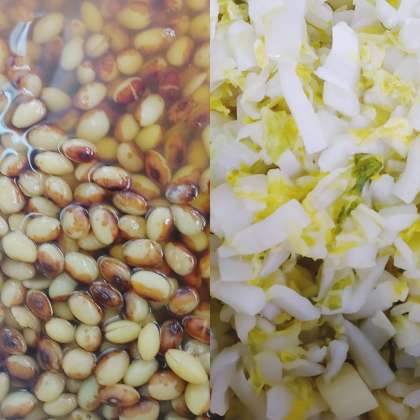 「はくさいの甘酢あえ」は、茹でたはくさいを、砂糖、塩、米酢を合わせたタレをかけてあえています。