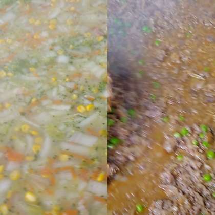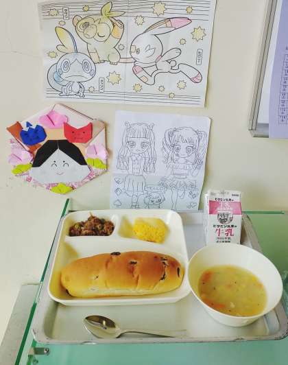 「コーンスープ」は、ベーコンの旨みとスイートコーン(クリーム缶)の甘味が調和した、児童に人気のあるスープです。彩りにパセリを使用しています。