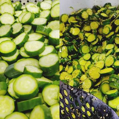 「きゅうりのナムル風」は、焼き物機で蒸したきゅうりに、砂糖、塩、米酢、うすくちしょうゆ、ごま油、いりごまで作った調味液をかけ、あえています。