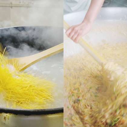 「さけのクリームスパゲッティ」は、紅ざけ フレーク を使用して、春らしい淡いピンク色に仕上げます。ホワイトルウは、バターを使用していないので、クリームとチキンブイヨンで旨みを加えています。