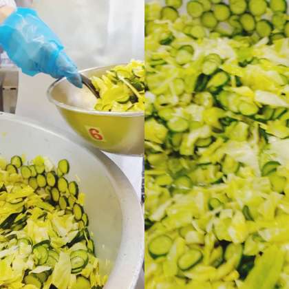 「 キャベツときゅうりのサラダ 」は、焼き物機で蒸したキャベツときゅうりに、砂糖、塩 、ワインビネガー、綿実油で作ったドレッシングをかけてあえています。