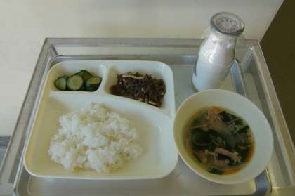 チンジャオニューロウスー・ワンタンの皮のスープ・きゅうりの辛みづけ・ご飯・牛乳です。