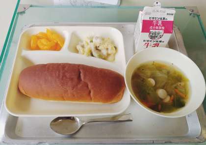黒糖パン・マカロニグラタン・レタスのスープ・みかん缶