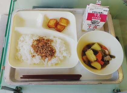 鶏肉とじゃがいもの煮物・あつあげのしょうゆだれかけ・紅ざけそぼろ