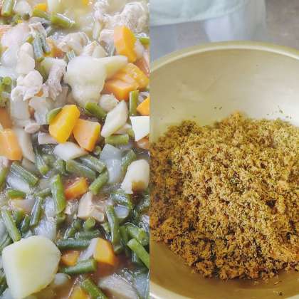 「紅ざけそぼろ」は、紅ざけといりごま、青のりをいって調味料で味付けしています。ご飯によく合う一品です。