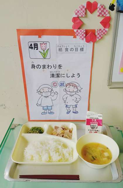 「みそ汁」は、とうふ、キャベツ、にんじん、えのきたけを使った具だくさんのみそ汁です。青みに青ねぎを使用しています。