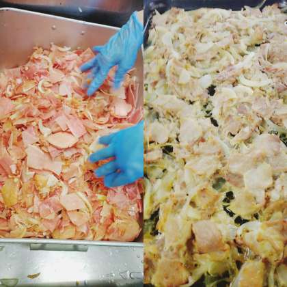 「豚肉のしょうが焼き」は、しょうが汁、砂糖、料理酒、みりん、こいくちしょうゆ、綿実油で下味をつけた豚肉に、たまねぎを加えて混ぜ合わせ、焼き物機で焼きます。