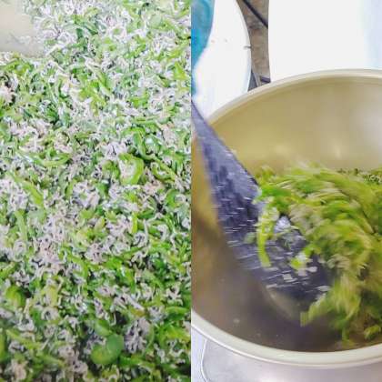 「じゃこピーマン」は、ピーマンとちりめんじゃこを綿実油でいため、砂糖、料理酒、こいくちしょうゆで味つけします。