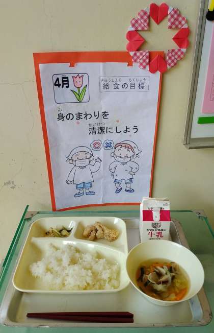 ごはん・鶏肉のからあげ・中華スープ・チンゲンサイともやしの甘酢あえ
