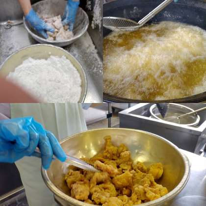 「鶏肉のからあげ」は、鶏肉(もも皮付大)に、しょうが汁、にんにくなどで下味をつけ、でん粉をまぶし、風味よくあげます。