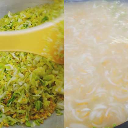 「キャベツとコーンのソテー」は、キャベツとコーンを綿実油でいため、塩、こしょうで味つけしています。