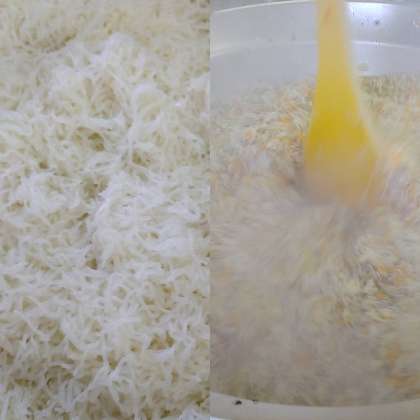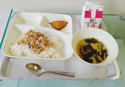 「豚丼」 は、豚肉、糸こんにゃく、たまねぎ、にんじんをいためて煮、ご飯に合う味つけに仕上げています。斜め切りの青ねぎで彩りを添えています。5月は水分が多い新たまねぎを使用するので、だしの量を減量しています。