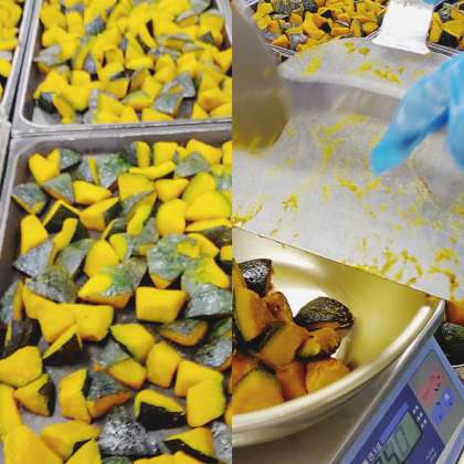「かぼちゃのしょうゆ焼き」は、綿実油、みりん、こいくちしょうゆで下味をつけた冷凍のかぼちゃを焼き物機で焼きます。