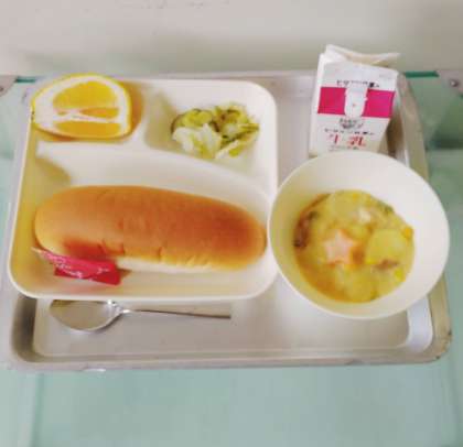 コッペパン・コーンクリームシチュー・キャベツときゅうりのサラダ・かわちばんかん・いちごジャム
