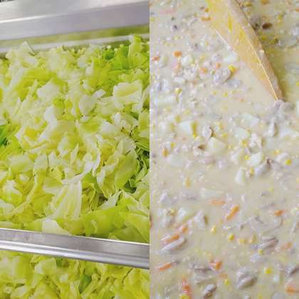 「コーンクリームシチュー」は、鶏肉を主材に、粒のコーンとクリーム状のスイートコーンを使ったクリームシチューです。今回のホワイトルウは、使用制限のあるバターと綿実油を併用しています。