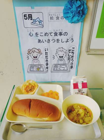 黒糖パン・豚肉と野菜のカレースープ煮・変わりピザ・みかん缶