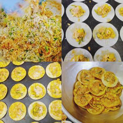 「変わりピザ」は、ツナ缶、コーン、ピーマン、ピザソース、チーズを混ぜ合わせて、ぎょうざの皮の上にのせ、焼き物機で焼く人気の献立です。