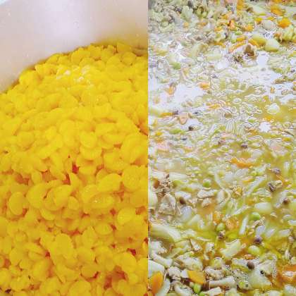「豚肉と野菜のカレースープ煮」は、豚肉を主材に、じゃがいも、たまねぎ、キャベツ、にんじん、しめじ、青みにむきえだまめを使用しています。カレー粉を使用することで、いつものスープ煮の味に変化をつけています。