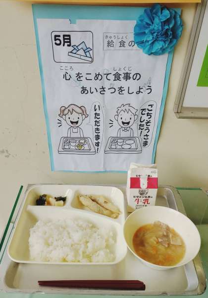 ごはん・きびなごてんぷら・豚汁・わかたけ煮