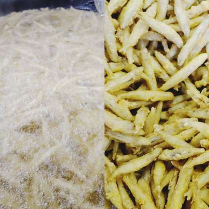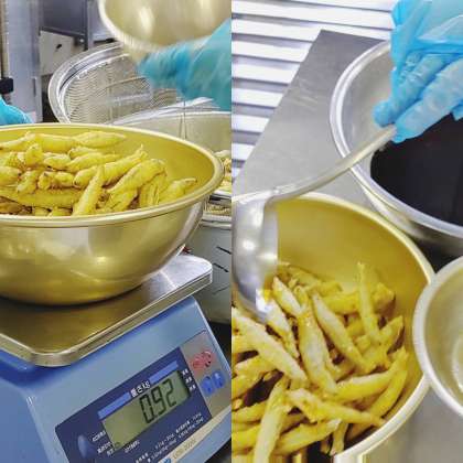 「きびなごてんぷら」 は、冷凍のまま、170度のなたね油でからりとあげ、砂糖、みりん、米酢、こいくちしょうゆ で 作ったタレをかけます。