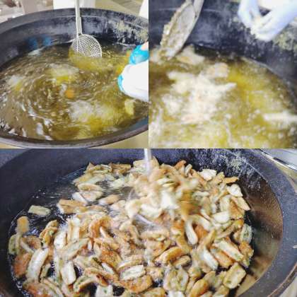 「いそべあげ」は、あげ衣にのりを混ぜたり、材料にのりを巻いて衣をつけたりしてあげる料理のことです。 「ち くわのいそべあげ」 は、ちくわに、あおのりを加えた衣をつけ、からりとあげています。