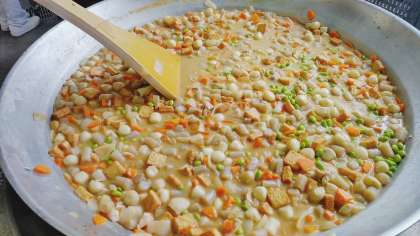 「あつあげとさといものみそ煮」は、 あつあげとさといもの他に、鶏肉、つなこんにゃく、たまねぎ、にんじん、青みにむきえだまめを使用し、砂糖、こいくちしょうゆ、赤みそで味つけして煮含めています。