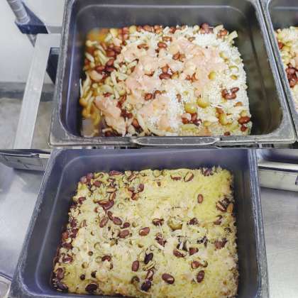 「金時豆の中華おこわ」は、もち米に鶏肉、金時豆(ドライパック)、しめじを加えて蒸し焼きにします。チキンブイヨンとごま油で、コクと旨みを出した一品です。もち米は、ぬるま湯につけます。