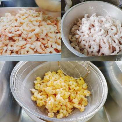 「えびのチリソース」は、塩、こしょう、料理酒で下味をつけたえびにでん粉をまぶし、なたね油であげます。しょうが、にんにく、トウバンジャンを香りよくいため、砂糖、こいくちしょうゆ、ケチャップを合わせた、少し辛みのきいたソースをからませます。えびは、今回は大を使用しています。