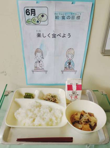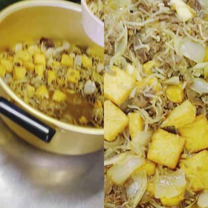 「すき焼き煮」は、牛肉、ふ、あつあげ、糸こんにゃく、たまねぎ、えのきたけを砂糖、みりん、塩、こいくちしょうゆで甘辛く味つけします。はくさいが使用できない時季ですのでたまねぎを使用しています。この献立は【ふ】の個別対応献立です。