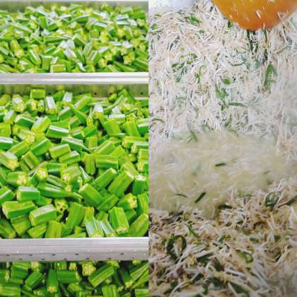 「オクラのかつお梅風味」は、オクラを焼き物機で蒸し、かつおぶし、梅肉、砂糖、米酢、うすくちしょうゆを合わせた調味液を配缶時にかけあえます。