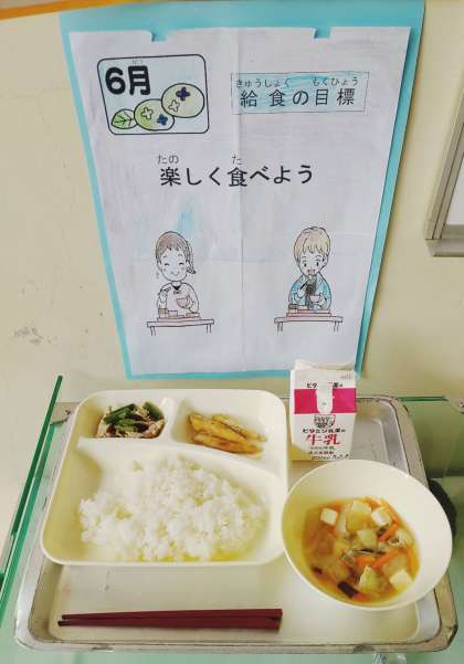 いわしのてんぷら・五目汁・豚肉とさんどまめの炒め物