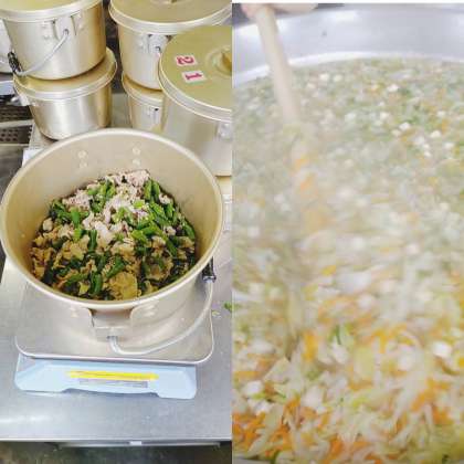 「五目汁」は、とうふ、キャベツ、たまねぎ、にんじん、青みに青ねぎを使用しています。