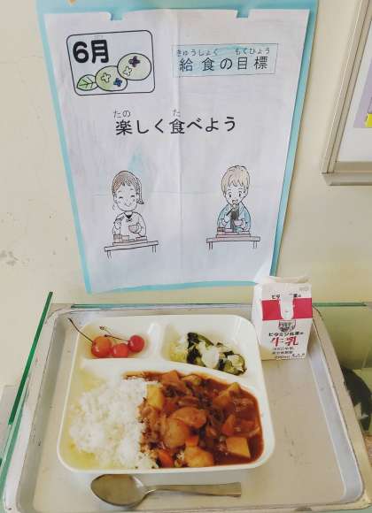 「さくらんぼ」は、小学校は1人3コずつです。山形産のさくらんぼです。