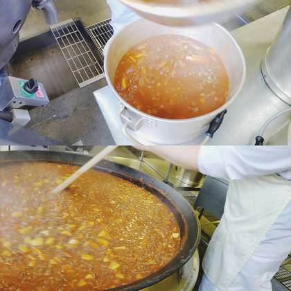「ハヤシライス」は、牛肉、じゃがいも、たまねぎ等の具材をトマトピューレ、ケチャップで煮こみ、デミグラスソース、ウスターソース、トンカツソース等で味つけし、手作りのブラウンルウでとろみをつけます。