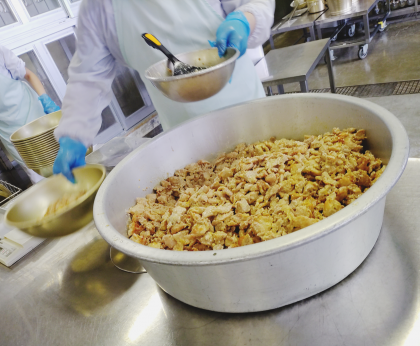 「鶏肉のしょうゆマヨネーズ焼き」は、鶏肉に料理酒、塩、こいくちしょうゆ、マヨネーズで下味をつけ、焼き物機で焼きます。