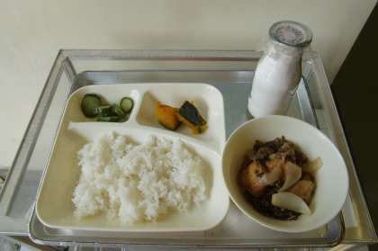 すき焼き煮・きゅうりの酢のもの・焼きかぼちゃの甘みつかけ・ご飯・牛乳です。